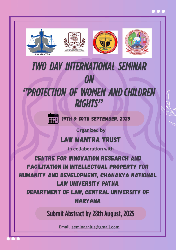 Call for Papers 2 Days International Seminar on “Protection of Women and Children Rights” Date: 19th & 20th September, 2025 Organized by Law Mantra Trust, Centre for Innovation Research and Facilitation in Intellectual Property for Humanity and Development, Chanakya National Law University Patna & Department of Law, Central University of Haryana; Submit Abstract by 28th August