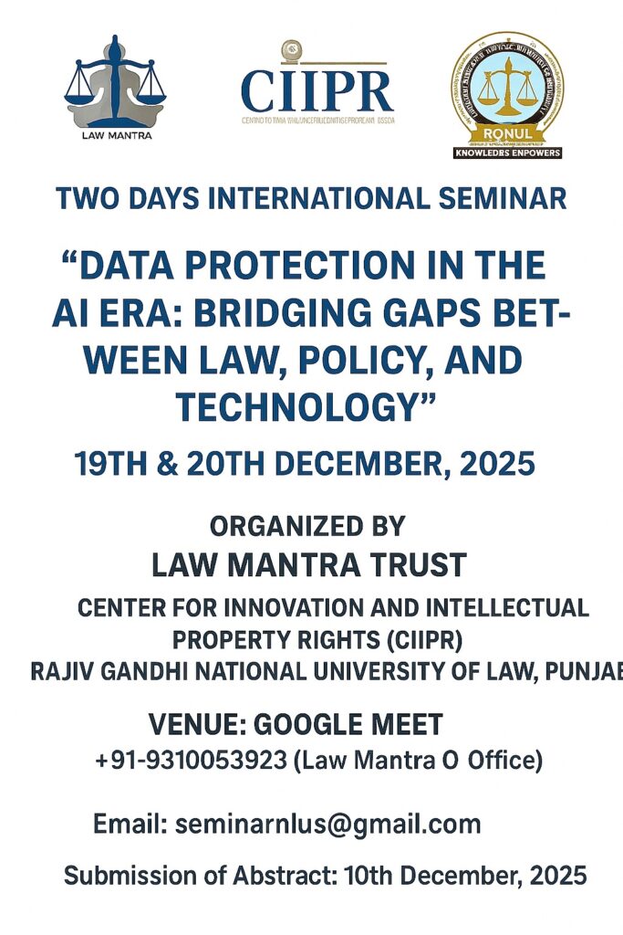 Call for Papers Two Days E-International Seminar on “Data Protection in the AI Era: Bridging Gaps Between Law, Policy, and Technology” Date: 19th & 20th December, 2025 Organized by: Law Mantra Trust in academic collaboration with Centre for Innovation and Intellectual Property Rights (CIIPR), Rajiv Gandhi National University of Law, Punjab Submit Abstract by: 10th December, 2025