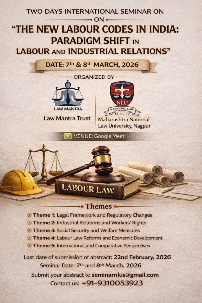 Call for Papers Two-Day E-International Seminar on “The New Labour Codes in India: Paradigm Shift in Labour and Industrial Relations” Date: 7th & 8th March, 2026 Organized by: Law Mantra Trust in collaboration with Maharashtra National Law University, Nagpur; Submit Abstract by 22nd February, 2026
